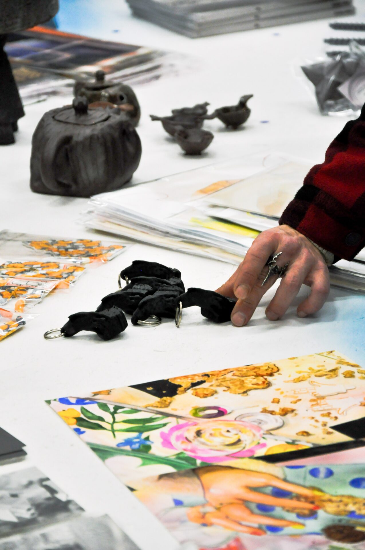 D’avril à juin, les deux artistes ont tissé des liens avec le territoire en partenariat avec 4 associations partenaires, spécialisées dans l’accompagnement au deuil et les rituels funéraires : Plan 9, EKR France, Naître et Vivre, De l’ombre à la lumière (Collectif National des morts de la rue). Margaux Bisson a œuvré à la conduite d’entretiens et à l’écriture, tandis qu’Eva a conçu la scénographie et la création éditoriale. Elles ont rencontré les habitant·es, bénévoles, professionnel·le·s funéraires, lors d’ateliers cuisine dans les maisons de quartier La Locomotive et La Mano, d’un atelier de fabrication de drapeaux commémoratifs, et de moments conviviaux. Elles ont aussi rencontré les agent·e·s du cimetière et gestionnaires de la biodiversité.